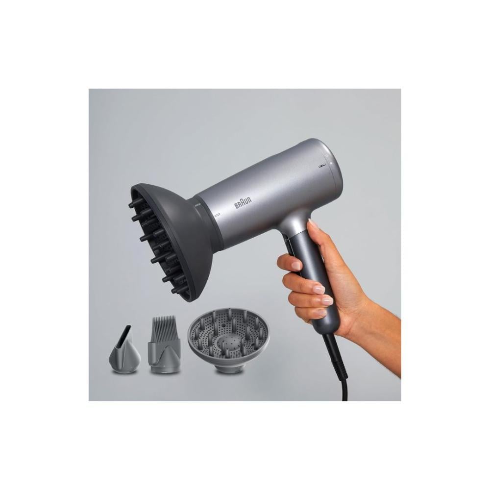براون مجفف الشعر HD4.3 – أداء فائق، تصفيف احترافي، لمعان وحماية – 2200 واط، محرك HTDC، تحكم باللمس، مع 3 ملحقات (فوهة تجفيف، مشط فرد، ناشر تجعيد) – رمادي كهربائياستمتعي بتجربة تصفيف متكاملة ونتائج احترافية في المنزل مع مجفف الشعر Braun HD4.3، المصمم ليمنحك القوة والتحكم والعناية اللازمة لجميع أنواع الشعر. بقوة 2200 واط ومحرك HTDC عالي الكفاءة، يوفر هذا المجفف تدفق هواء قوي لتجفيف أسرع، مع تقنية التحكم باللمس لسهولة اختيار الإعدادات المناسبة بدقة.